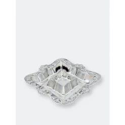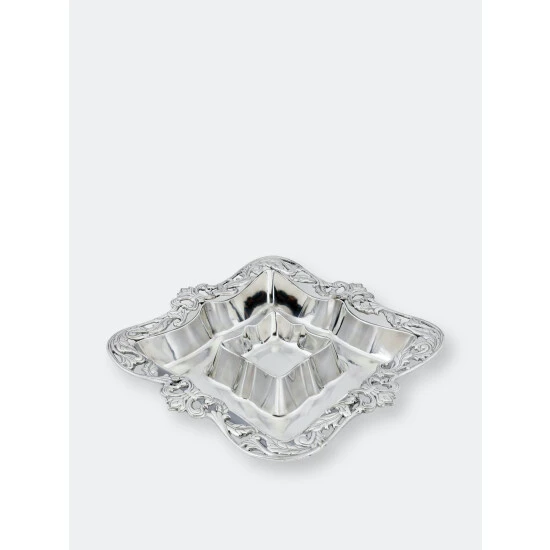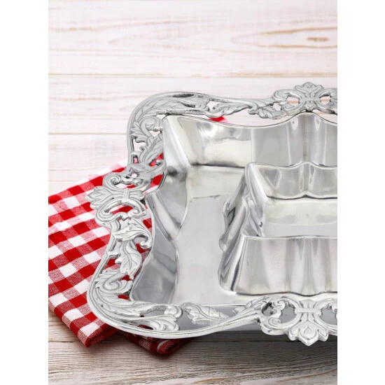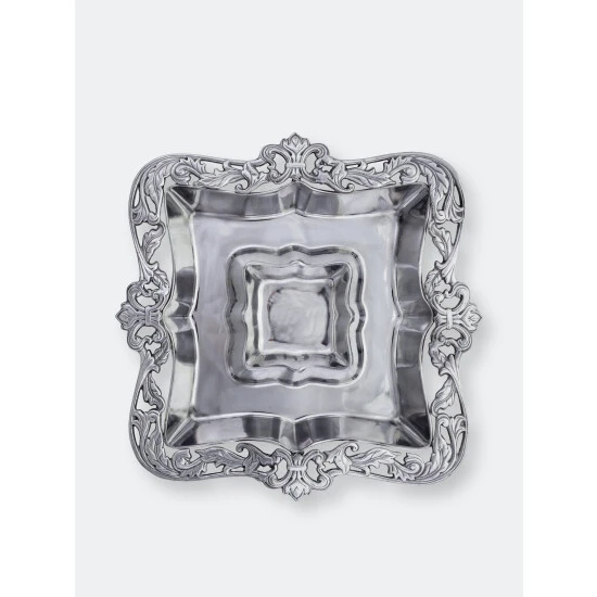 Envelop this go-to appetizer in the elegant design of Arthur Court’s Acanthus Chip and Dip.Fleur-de-lis symbols rest on each side of this piece as flourishing acanthus leaves connect them within an openwork border. The sauce bowl mirrors the shape of this design, while the entire handmade, aluminum tray displays a brilliant luster.