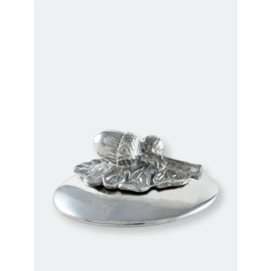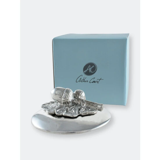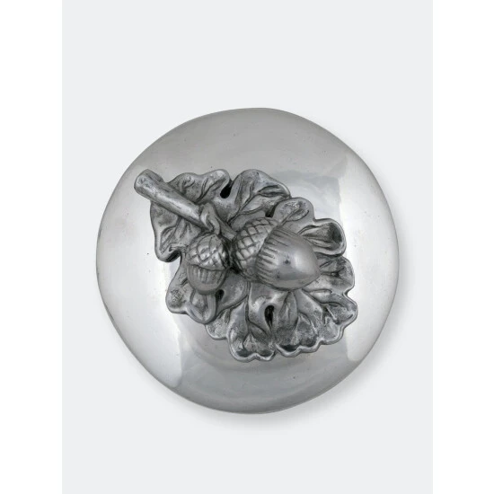 A detailed still-life of an acorn upon a bed of oak leaves provides finial / handle for this lovely, hand-crafted forest theme napkin weight. Anchored by a 3.5-inch aluminum disk to provide ample cover and weight to keep a stack of napkins orderly even when enjoying a breezy al fresco gathering.