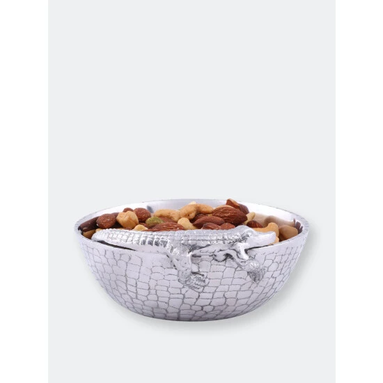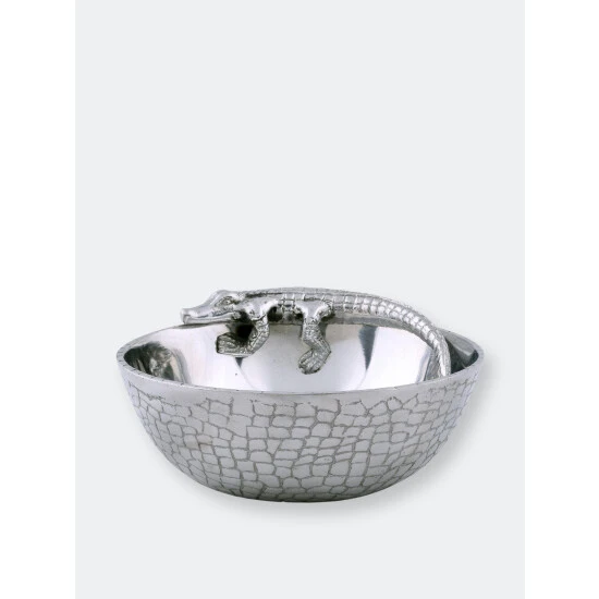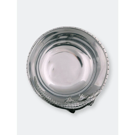 Induce a jaw-dropping reaction from your guests with this unique 6″ Alligator Bowl from Arthur Court.A stealthy alligator crawls along the edge of this piece, its legs clasping onto the side as its long, detailed tail swishes behind it. Handcrafted in lustrous aluminum, this bowl combines a shiny interior with a rough, scaly exterior for a beautiful mixture of textures
