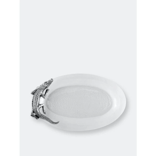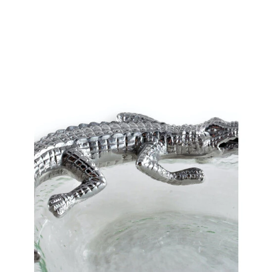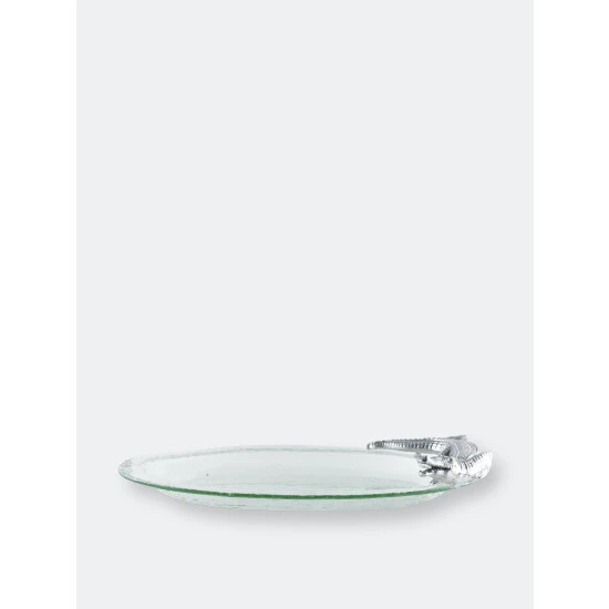Serve appetizers in elegant style with this Arthur Court alligator glass platter. This round platter is adorned with a handmade alligator that’s crafted from sturdy sand-cast aluminum. The alligator has realistic detailing, including textured skin that looks like scales, and it appears to be guarding the left side of the platter from sneaky hands. The lustrous buffed aluminum of the alligator body reflects against the glass of the tray for eye-catching elegance. It’s easy to clean this platter; simply wash it with mild dish detergent by hand and dry with a soft cloth. This Arthur Court alligator glass platter comes in a charming box, so it’s ready to be given as a gift. It makes a great present for birthdays and housewarming partiesA handmade, aluminum alligator patrols the left edge of this platter as it surveys who is brave enough to take its food. The reptile’s rough, patterned skin reflects a brilliant luster against the clear glass.