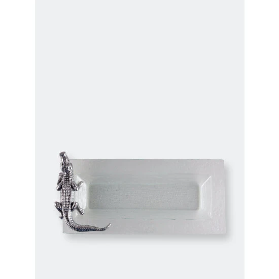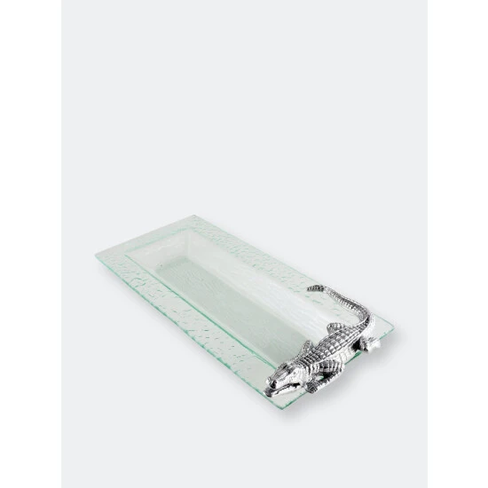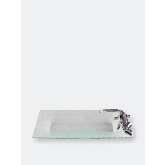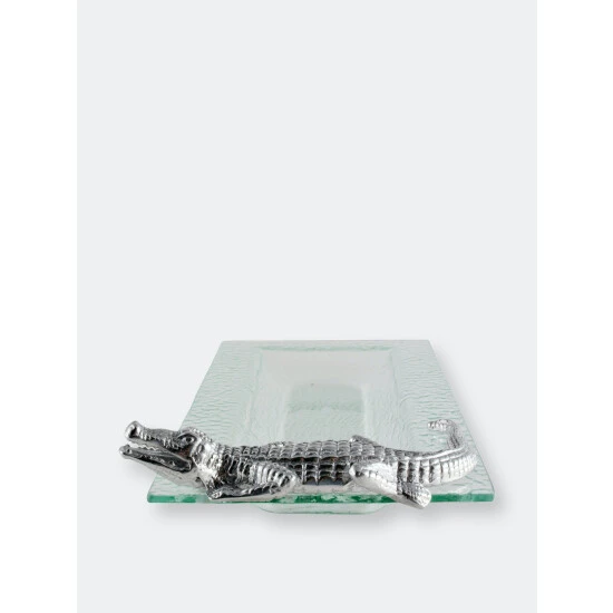 Thick textured glass, cut with a beveled slope, is accented with a finely wrought alligator decoration. This rectangular serving tray from arthur court is handle-free; the alligator, though firmly attached to the textured glass, is intended as a decoration, not a serving element. He is finely wrought from sand-cast aluminum, richly detailed from the sharp fangs to the scaly tail. The gator is a realistic replica of the real thing, complete with legs ready to pounce on guests trying to steal the food from his tray. The rippled interior of the glass echoes his watery home. At over a foot long, this tray is ideal for presenting a generous charcuterie selection or an array of fresh fruit and cheeses. The sloped sides allow food to be stacked safely, and the flat surface allows plenty of room for larger foods, such as a ham or a pile of roasted winter vegetables. The tray is not dishwasher safe; wash by hand with gentle soap and dry thoroughly.A handmade, sand-cast alligator fiercely guards the right side of this dish, growling at a would-be stealer of his food. The lustrous, aluminum reptile gleams brilliantly against the clear glass, making this tray a show-stealing addition to any buffet line.
