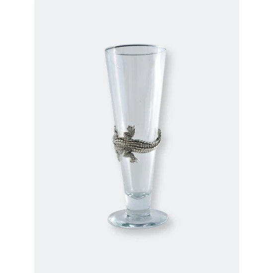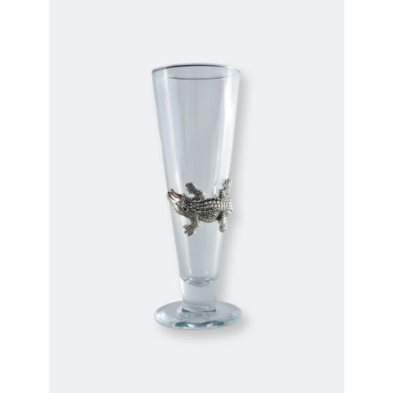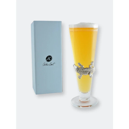 Accent your bar area with this Arthur Court alligator pilsner. This glass has a wide mouth for easy drinking while maintaining a healthy foam head on your beer, and it narrows to a traditional pilsner shape at the base. The quirky alligator on this glass is sand-cast for impeccable quality and polished to a gleaming shine as he seemingly swims among your beverage. This Arthur Court alligator pilsner glass comes in a box, so it’s ready for presentation. It makes a great gift for Gator fans, but it can also be used to enhance a coastal design style. If you want to give your gift a more formal appearance, simply wrap it in decorative paper and add a bow. This gator glass is both durable and stylish for long-lasting use.The glass opens wider as it builds toward the mouth of this easy-to-drink pilsner. Help any Gator fan celebrate with this 14 oz. glass.