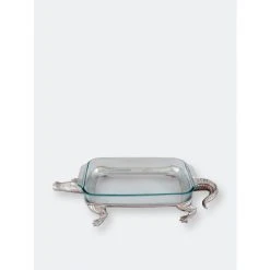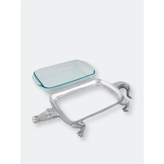 Walk out Arthur Court’s 3qt Alligator Pyrex Holder for a stunning entrance at your next dinner party.A stoic alligator stands on all fours to form base, while its rough, scaly tail swishes out the back. Colorful casseroles explode out of the dishwasher-safe Pyrex to accentuate the handcrafted, aluminum alligator.