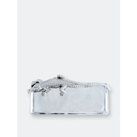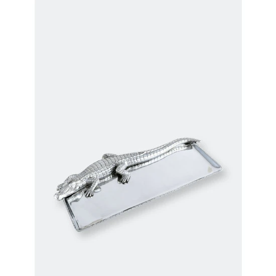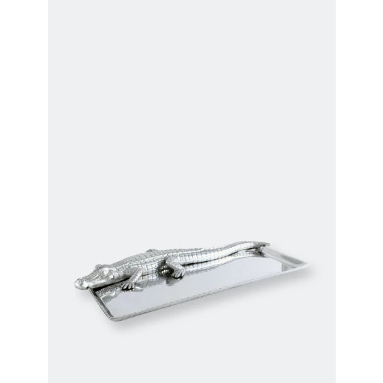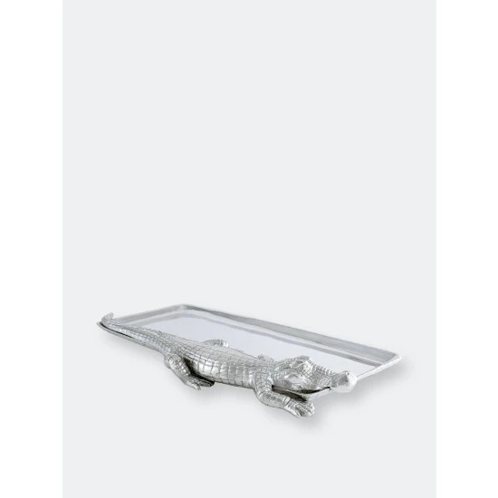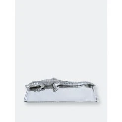 Offer great flexibility to your entertaining needs with this attractive 9×20 Alligator Tray from Arthur Court.A detailed alligator heads the piece, stretching its long body and tail the length of the dish. The scaly texture of its skin mixes well with the smooth, gleaming finish on the rest of the handmade, aluminum tray.
