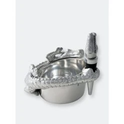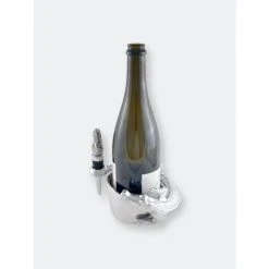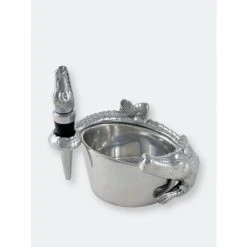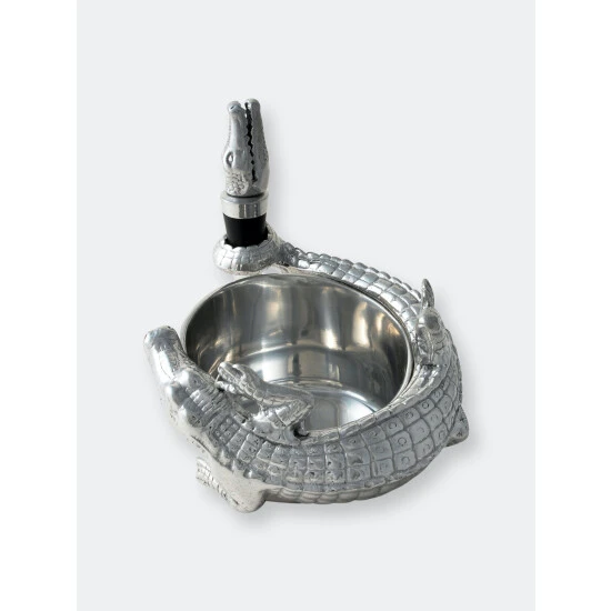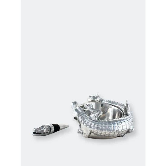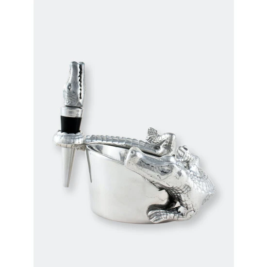 This Arthur Court alligator wine coaster and stopper set features a friendly gator nestled up to your favorite fruit of the vine. The shiny reptile that wraps its scaly body and tail protectively around the edge of the wine coaster just asks for admiration. Meanwhile, a wine stopper crowned with a finely crafted alligator head keeps wine fresh when you put the evening on pause. This 4 x 3-inch ornate barware lies flat against your bar or kitchen counter for easy display or tucks away to lie in wait in your cupboard. If you decide to take this sharp-toothed reptile on the prowl, it’s compact and lightweight so that it won’t swamp you down on the trek. This alligator wine coaster and stopper set from Arthur Court keeps your wine safe and sound.A scaly alligator wraps its long tail around the coaster as the end extends into a circular hold for the stopper. An open-mouthed alligator shoots up from the stopper to complete this handmade, aluminum design.