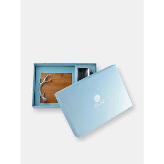 Dazzle your guests with the alluring fixtures in Arthur Court’s Antler Bamboo Cheese Set.A detailed antler adorns the left side of the board as its shimmering aluminum mixes beautifully with the bamboo’s soft color. The handcrafted antler, cheese knife and cracker stand all come included in this handsome set.