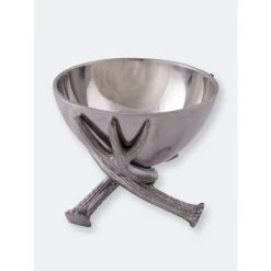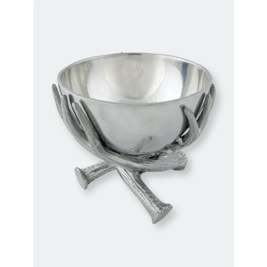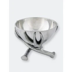 Raise the level of your serve ware with this beautifully designed 5.5″ Antler Bowl from Arthur Court.Three antlers overlap on the bottom of this piece to create a unique, balanced base. Fine lines within the beam and points on the antlers create a striking contrast against the smooth finish of the handmade, aluminum bowl.