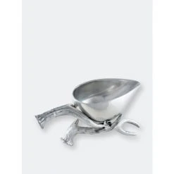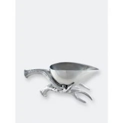 Set a stylish, wilderness-themed buffet for a special occasion with the antler motif collection from arthur court. Gleaming sand-cast aluminum is carved with detailed relief into a multipronged antler set, completely realistic from smoothly rounded tip to the circular base. Small grooves and dips give this gravy boat a rustic appeal. The antlers themselves create the handle and base of the vessel. The gravy boat itself is cast in one piece, smooth and shined to mirror-quality reflectiveness. Smooth flat “feet” keep your boat firmly on the table. This gravy boat is created from a designer aluminum alloy, intended to remain tarnish-free and approved to be food service compliant by the fda. to clean this gravy boat, wash by hand with gentle soap and warm water, then immediately towel dry. you may choose to buff your gravy boat with a chamois cloth for extra shine. This boat comes in a gift box, ideal for a wedding registry or housewarming present.