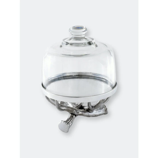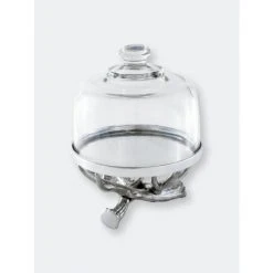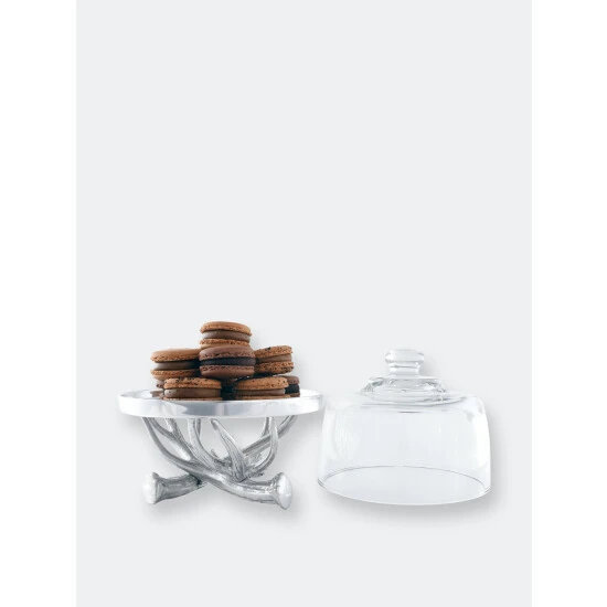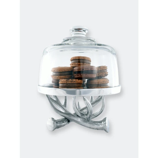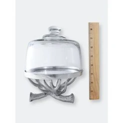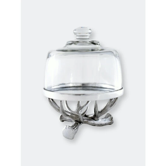 Maximize the visual appeal of your man cave or lodge-style space with this glass-domed antler plate by Arthur Court. This 8 x 8-inch plate and lid set boasts FDA-compliant sand-cast aluminum and glass construction for safe use whether you’re serving up game day appetizers or providing guests with sweet pastries or candy. Rely on the glass dome to help keep your offerings fresh and allow viewing of the contents before opening, and lift it off the plate easily thanks to the sturdy rounded handle. Intricate antler detailing beneath the plate itself infuses your room with nature-inspired charm, and the sleek silver finish complements virtually any room colors while imbuing timeless elegance. The dishwasher-safe glass dome makes cleanup a breeze, giving you ample time to hand wash the metal base with mild dish soap before drying it immediately. Present this rustic antler plate easily at weddings, housewarming parties and special events thanks to its attractive gift box.Multiple antlers weave around each other before propelling the dome up for a fairylate finish on their sturdy points. Handcrafted in sand-cast aluminum, the base’s intricate detail displays in a brilliant luster.