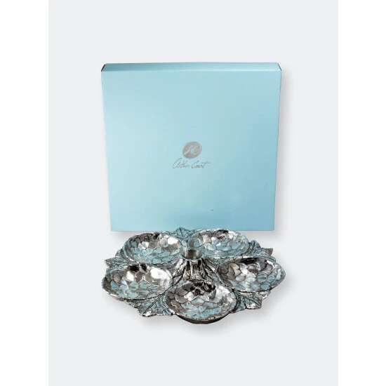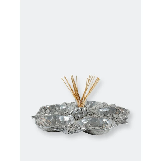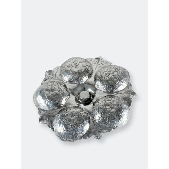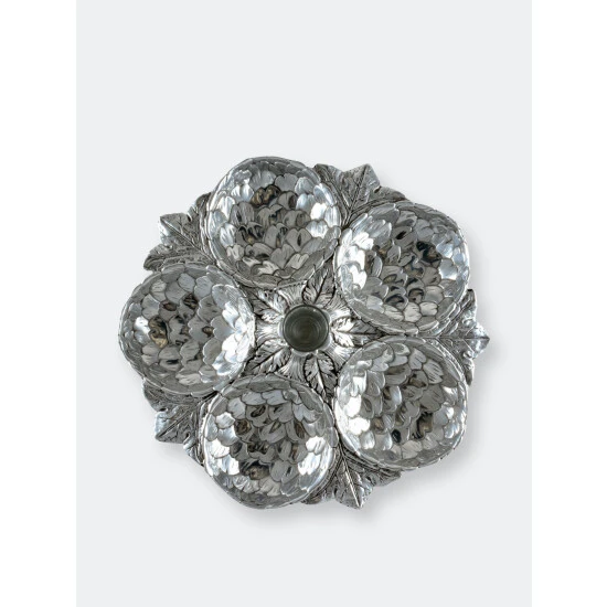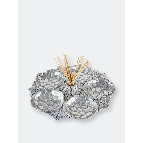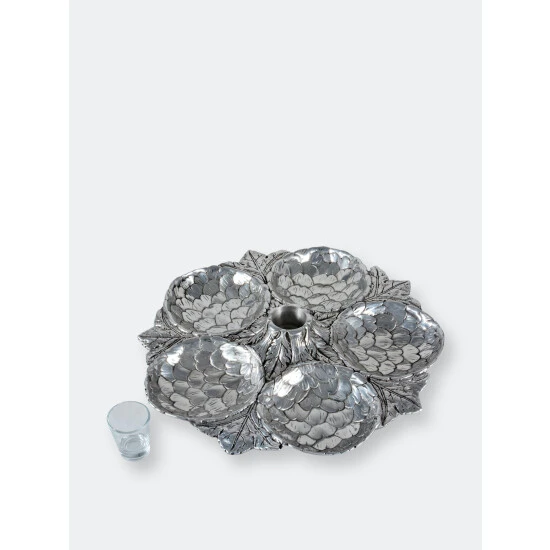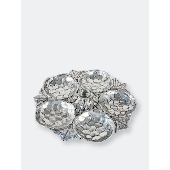 Five amazingly detailed Globe artichoke “bowls” arranged in a circle on a bed of feathery artichoke leaves connected to a votive-sized glass holder in the middle, this tray is a stunning way to serve an assortment of crudités, olives or any antipasto collection. The glass holder in the middle will hold picks, hors d’oeuvres forks or even a tealight candle.
