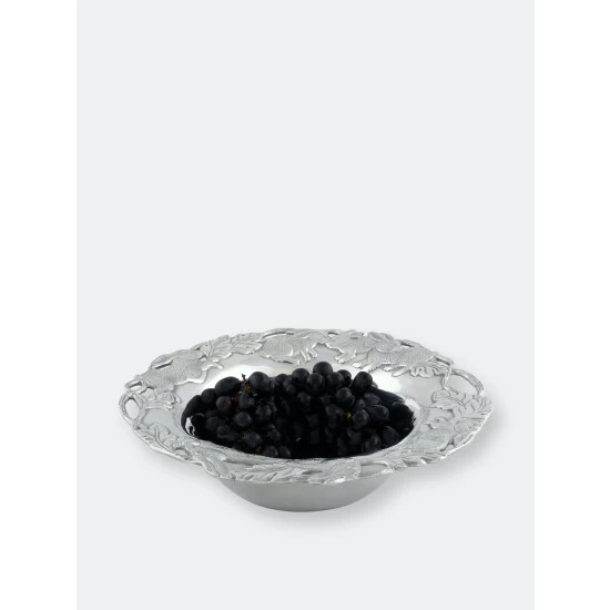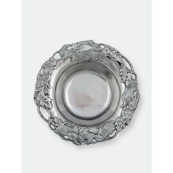 Fascinate your guests with the beautiful craftsmanship of this 13″ Bunny Bowl from Arthur Court.Sand-cast to lustrous perfection, this aluminum bowl glistens to the point where it seems to swirl; a pattern which the surrounding rabbits seem to follow. These detailed animals run among veiny leaves near the edge as vines create an openwork border around them.