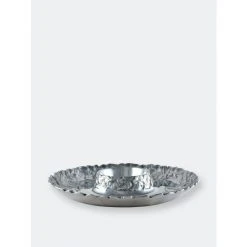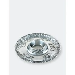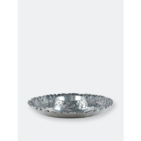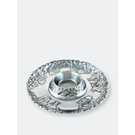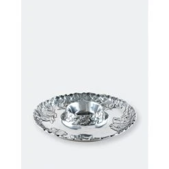 Distinguish this appetizer with the remarkable craftsmanship of Arthur Court’s Bunny Chip and Dip.Veiny leaves create the piece’s jagged border as detailed rabbits rest up against the dense foliage. Handcrafted in lustrous aluminum, the piece also features similar designs along the exterior of the sauce bowl.