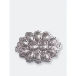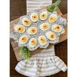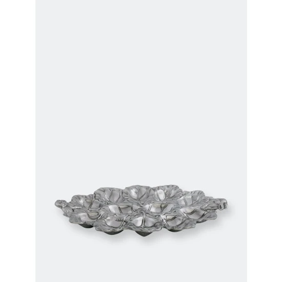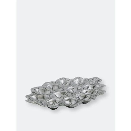 Sophisticate this Easter favorite with the remarkable definition of Arthur Court’s Bunny Deviled Egg Holder.Detailed rabbits sit prominently on opposite ends of this piece, while veins flow through the leafy-patterned interior and along the edges. Handcrafted in sand-cast aluminum, this holder’s rustic design gleams brilliantly against bright colors. Holds 12 deviled eggs