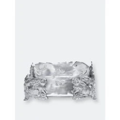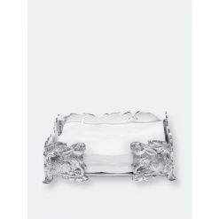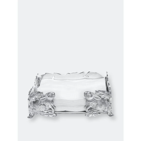 Brighten your brunch table with this charming Bunny Luncheon napkin box from Arthur Court. Delightful leaves handcrafted in aluminum form the framework that keeps your napkins neat and attractive, while adorable bunnies protect the front edges from becoming frayed. This handsome napkin box is made from sand-cast aluminum that’s compliant with FDA regulations, and it’s an ideal choice to set out at a baby shower or Easter buffet. The shiny finish doesn’t tarnish over time, and the only maintenance required is an occasional dusting with a damp cloth. Pair the rustic elegance of this napkin box with other bunny-themed pieces, or wrap it in the included gift box to present as a hostess gift, housewarming present or wedding gift to a friend who loves to entertain.Detailed rabbits stand guard at the front corners of this piece, while exquisitely patterned leaves create the openwork design on the sides. Handcrafted in sand-cast aluminum, this box exudes a rustic elegance that wont’ go unnoticed.