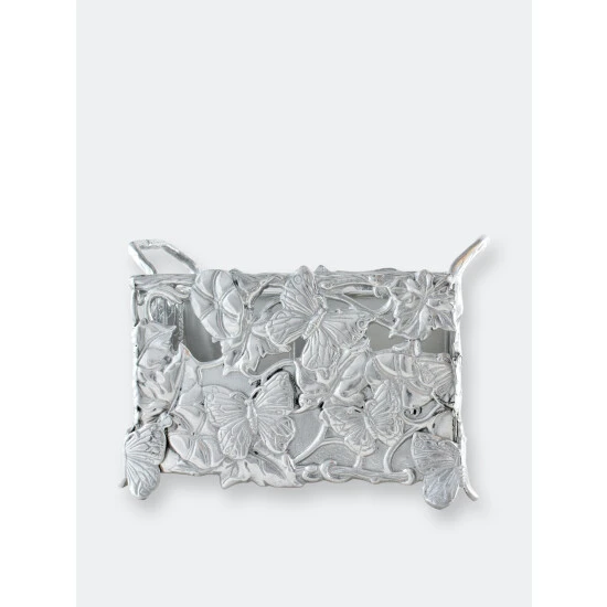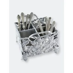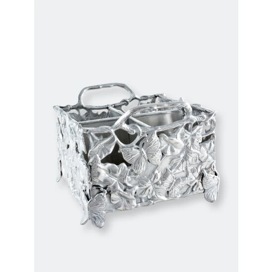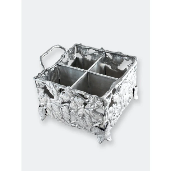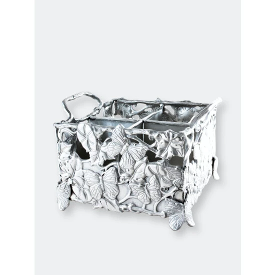 Finely detailed butterflies, flowers and vines flow brilliantly as they blanket each side of this piece. Heavy lines in the wings and petals define each animal and blossom on the busy caddy. Durable, vine handles make this handmade, aluminum piece both fun and easy to use.Startle your guests with the lifelike appeal of Arthur Court’s Butterfly Flatware Caddy.