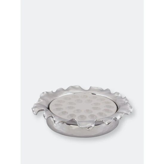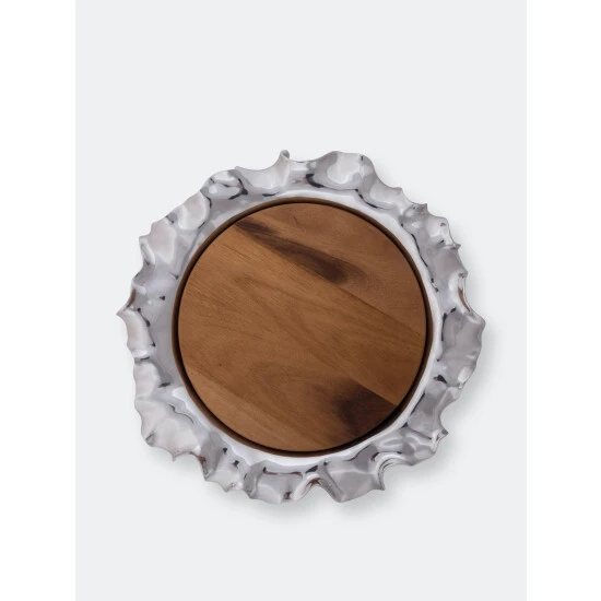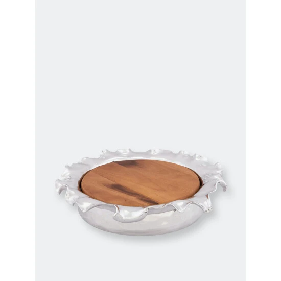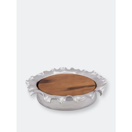 Sensuous shining waves of shining Arthur Court aluminum alloy surround a strikingly striated acacia wood serving board, perfectly sized for a small cheese service or a selection of appetizers. Wood board removes for cleaning. Arthur Court’s wavy edged Carmel Collection is California inspired by the fairy tale village of Carmel-by-the Sea. Nestled into the rolling hills where California’s central coast meets the gentle waves of the Pacific, the magical hamlet is filled with storybook cottages wearing roofs that swoop and roll, echoing the undulating waves of the sea. Size: 18″ Diameter 4″ Tall Care: Wash by hand with mild dish soap and dry immediately – do not put in dishwasher.