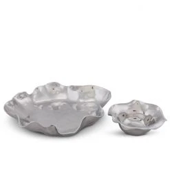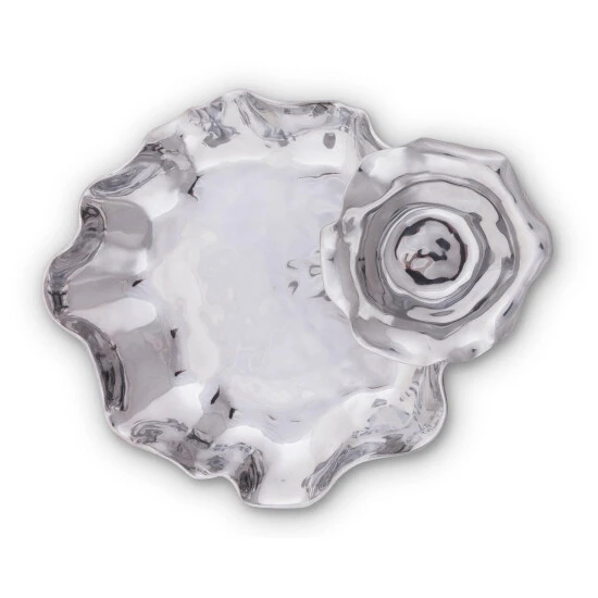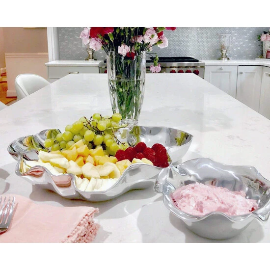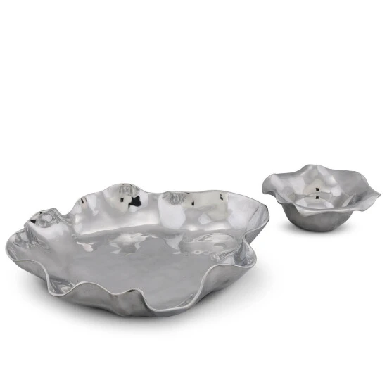 Simply place this Arthur Court Carmel chip and dip set on any table in your home to receive compliments from guests on its artistic beauty. When not being used to serve chips, nuts or other nibbles, this serving dish holds its own as a work of modern art. Inspired by the California village of Carmel-by-the-Sea, this shiny serving set mimics the gentle waves of the Pacific Ocean with its curving edge design. The smaller dip bowl is removable if preferred, and it fits sturdily onto the chip platter for versatility of service. Though delicate-looking, this Arthur Court chip and dip set is durably constructed from premium signature aluminum alloy that is FDA-compliant. At 15 inches long and 14 inches wide, this platter holds enough snacks for parties or small dinner gatherings. Arthur Court’s wavy edged Carmel Collection is California inspired by the fairy tale village of Carmel-by-the Sea. Nestled into the rolling hills where California’s central coast meets the gentle waves of the Pacific, the magical hamlet is filled with storybook cottages wearing roofs that swoop and roll, echoing the undulating waves of the sea.