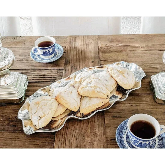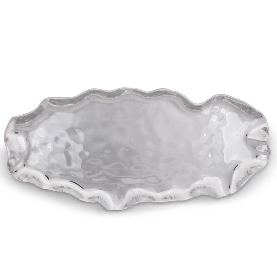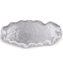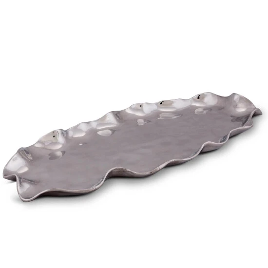 The rippled, polished aluminum of the Carmel Collection oblong serving tray from Arthur Court echoes the relentlessly undulating waves of the Central Coast of California. Inspired by the quaint hamlet of Carmel-by-the-Sea, this scalloped-edge vessel makes an eye-catching centerpiece on any buffet or formal table. Heavy aluminum, polished to a mirror-like shine, is forged with small dimples on the base of the dish and low, gently waving sides. Although the server is handle less, subtly ergonomic waves allow for easy handling and transport. The dish measures 20 x 9 inches, large enough to hold a family-sized serving of sliced roast, heaps of brightly colored fall vegetables or cool and refreshing cut fresh fruit. Care for your handcrafted Carmel free-form serving tray by washing by hand with soap and hot water and polishing as needed. Arthur Court’s wavy edged Carmel Collection is California inspired by the fairy tale village of Carmel-by-the Sea. Nestled into the rolling hills where California’s central coast meets the gentle waves of the Pacific, the magical hamlet is filled with storybook cottages wearing roofs that swoop and roll, echoing the undulating waves of the sea. Size: 20″ Long x 9″ Wide Care: Hand-wash in warm, soapy water, dry thoroughly.