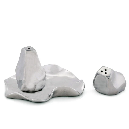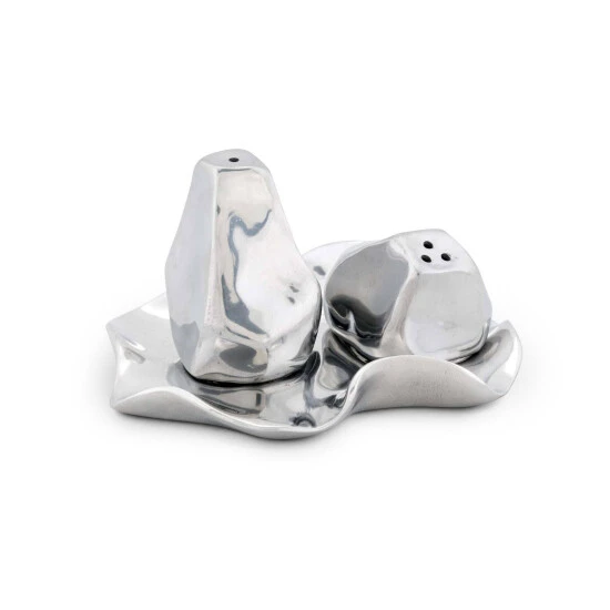 Like liquid metal, the two different shaped shakers seem to float on the wavy edged aluminum tray that is part of this unique ensemble. A functional and beautiful décor accent in the popular wavy edged design, the Carmel Collection is known and appreciated for. Sometimes it’s the little things, that make a big difference. These stylish handcrafted salt and pepper shakers in a very unique shape and modern design, add a touch of luxury to every table. Size: 6″H x 3″W x 7″L Care: Wash by hand with mild dish soap and dry immediately.