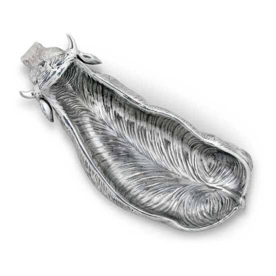 Generously sized, very detailed handcrafted tray that will hold large meats and add style and luxury to every table. The back of the Cow is completely hollow and offers enough space for large briskets, ribs, tri tip and more. Invite all of your friends and loved ones and be assurded that you have the perfect tray to serve your delicious food creations. Aluminum has the highest thermal conductivity and will keep your meals longer hot and tasty. This tray is definitely a conversation starter.