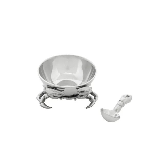 The removable bowl sits perfectly inside the crab’s hollowed shell, while its realistic pinchers help stabilize the piece. A ribbed claw also creates a textured grip on the spoon’s handle to complete this handmade, aluminum set. Complement your Coastal Collection with this 3-Piece Crab Condiment Set from Arthur Court. Size: Plate: 7″ Dia. Bowl: 5-1/4″ Dia. Spoon: 5″L Care: Wash by hand with mild dish soap and dry immediately – do not put in dishwasher.