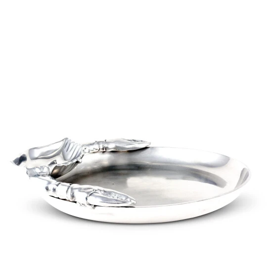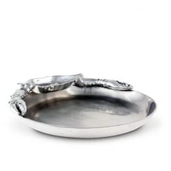 Watch over your favorite appetizer with the helpful guard in Arthur Court’s Crab Chip and Dip. As if lounging in a hot tub, an intricate crustacean hangs its eight legs over the side and rests its claws on the rim of this dish. The smooth interior of this handmade, aluminum piece displays a brilliant luster against the crab’s textured body.
