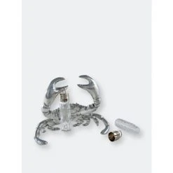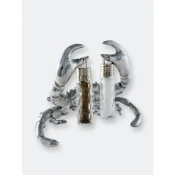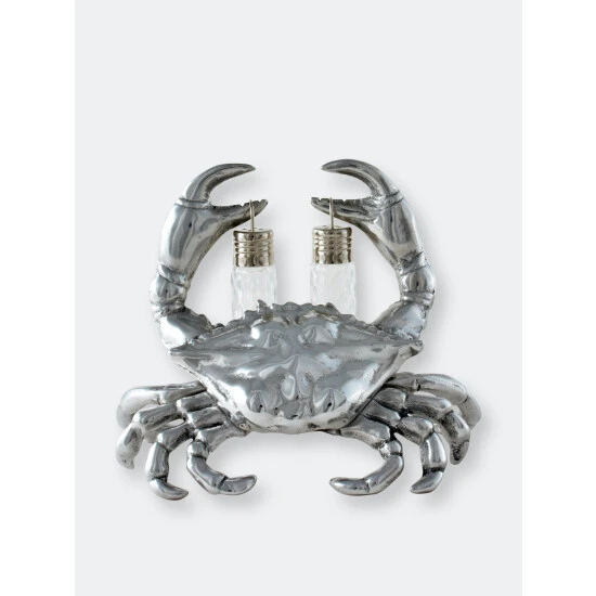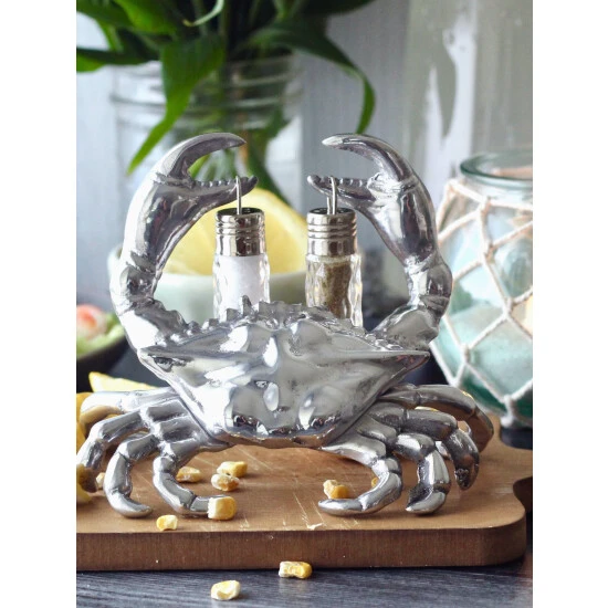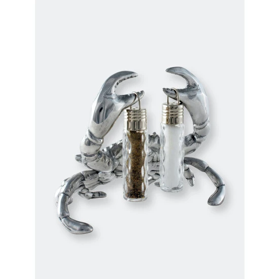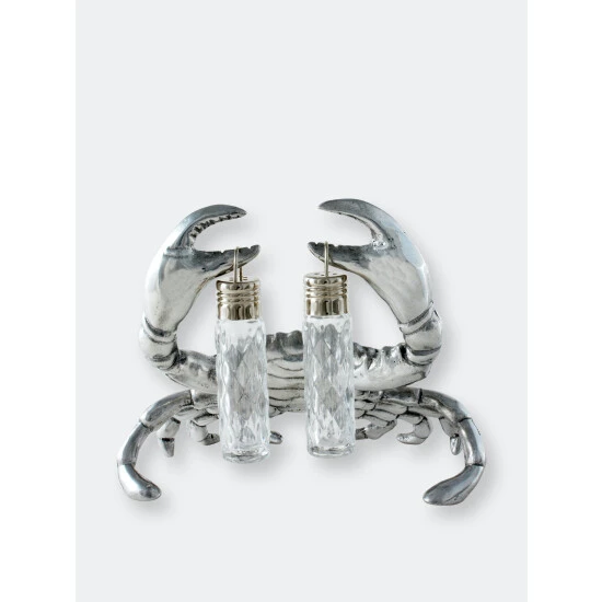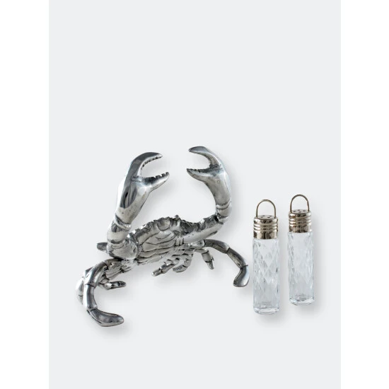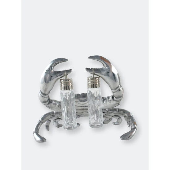 Take a pinch…. if you dare from Arthur Court’s Crab Hanging Salt and Pepper Set.Distinct lines highlight each section of the crab’s exoskeleton in its body, claws and legs. This realistic definition gives the statuette tremendous appeal. The removable, glass dispensers hang from each of its pincers in this handmade, aluminum piece.