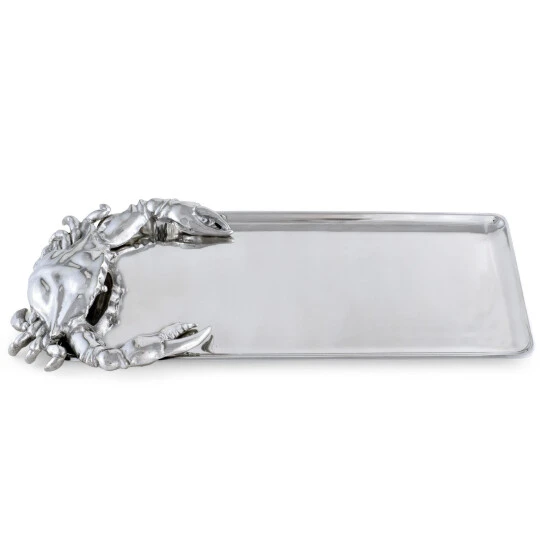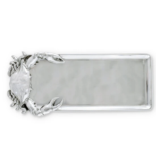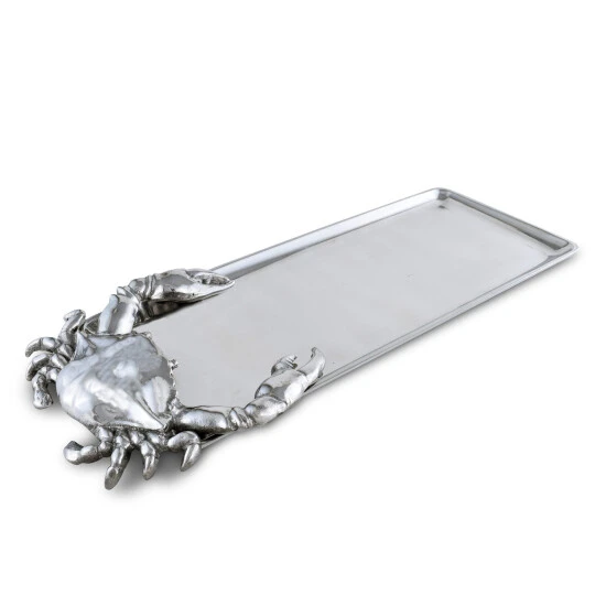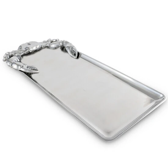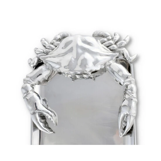 Nip at your guests until they try whatever meal you display on Arthur Court’s Crab Oblong Tray. A large crab dangles its legs off the side of this dish as it seemingly tries to crawl back on and steal any leftovers. Distinct lines and sharp points within the crustacean’s design contrast beautifully with the sleek interior of this handmade, aluminum tray. Size: L: 18.0″ / W: 7.0″ / H: 1.0″ Care: Wash by hand with mild dish soap and dry immediately – do not put in dishwasher.