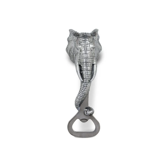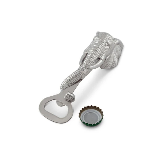An elephant’s trunk has over 40,000 muscles, and this tough elephant bottle opener from Arthur Court powers open the tightest bottle caps to let you hydrate quickly. Handcrafted aluminum alloy lends an appealing shine to this masterfully designed barware, and the sculpted wrinkles in this wise pachyderm’s skin provide a solid grip during use. Inquisitive eyes and intricately detailed ears and tusks capture the iconic features of these gentle giants and make this a great display piece for your counter or bar area. However, this 5.5 x 2-inch utensil conveniently tucks away in drawers or cupboards and is small enough to carry with you on outings. Elephants have warm greeting rituals when they meet up with friends, and you can effortlessly open a cold beverage to welcome your favorite guests with the help of this sturdy Arthur Court elephant bottle opener. An intricately-detailed elephant head forms the handle of this piece, its long, rippled trunk snaking around the opener’s neck. Large tusks and gentle eyes provide even more lifelike appeal to this handmade, aluminum bottle opener. Size: L: 5.5″ / W: 2.0″ Care: Wash by hand with mild dish soap and dry immediately – do not put in dishwasher.