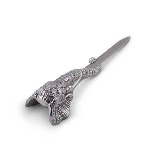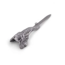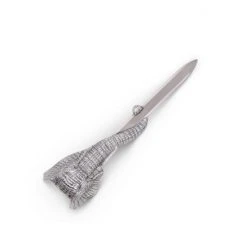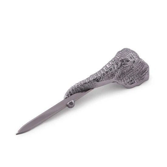 Make opening letters exciting with this bold elephant letter opener from Arthur Court. The elephant’s head is easy to grasp as its trunk wraps around the sleek stainless steel blade, and the texture of its rugged skin adds an element of realism to this piece that combines beauty and functionality. Protect your hands from paper cuts every time you pick up this striking letter opener, which is crafted from a handmade, hand-polished aluminum alloy that doesn’t require any maintenance other than dusting with a damp cloth. You’ll feel the quality every time you use this unusual letter opener to slice easily through envelopes, and it comes with an attractive gift box, making it an ideal present for an animal lover celebrating graduation or a new job. The sleek blade acts a third tusk as this elephant wraps its trunk around the base of the piece. The animal’s rugged, wrinkly skin gives this handmade, aluminum opener a realistic appeal and texture. Size: L: 11.0″ Care: Dust with damp cloth. Will not tarnish