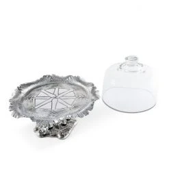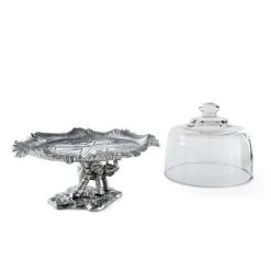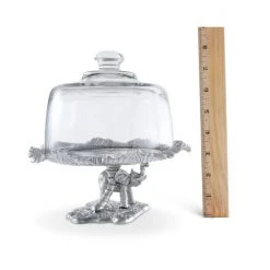 Preserve the freshness of baked goods using our Elephant Plate with Glass Dome A sculptural work of metal art, the base depicts an elephant standing at the base of a tree as its leafy crown fans out to support the glass dome. Heavy lines distinguish each leaf and ripple in the tree trunk of this handmade, aluminum design.Please note, this is a small stand designed to hold a few cookies or a couple of cupcakes or muffins.
