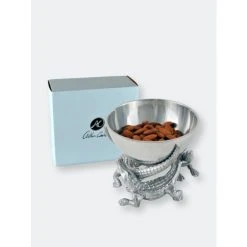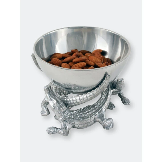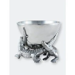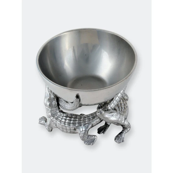 Entice more than alligators with your signature meal by serving it in Arthur Court’s 5.5″ Elevated Bowl. Playful alligators swarm around the base of this piece as their various body parts lift it off the ground. The smooth dish looks especially lustrous against the scaly skin of the statuettes. Handcrafted in sand-cast aluminum, the bowl is perfect for sauces or finger foods.