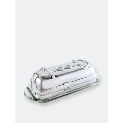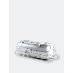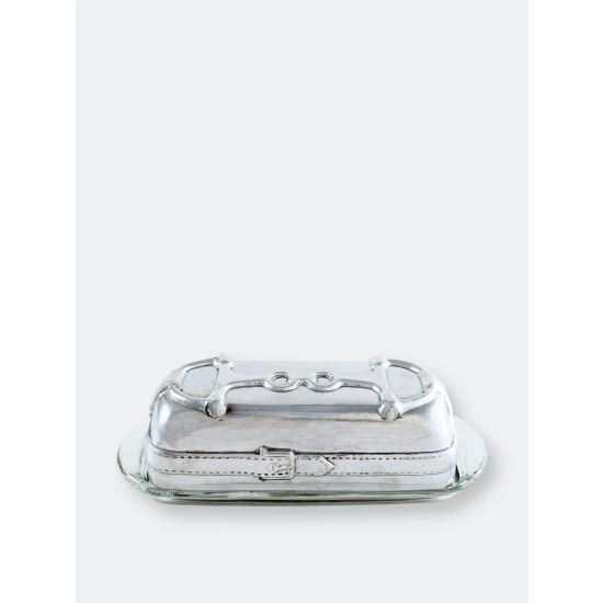 A bit displays across the top of this piece as two, leathery straps loop around its rein rings and curve towards the base. Another strap wraps around the bottom of this handmade, aluminum piece before buckling on one side.Look the part of an experienced rider with this Equestrian Butter Dish from Arthur Court.