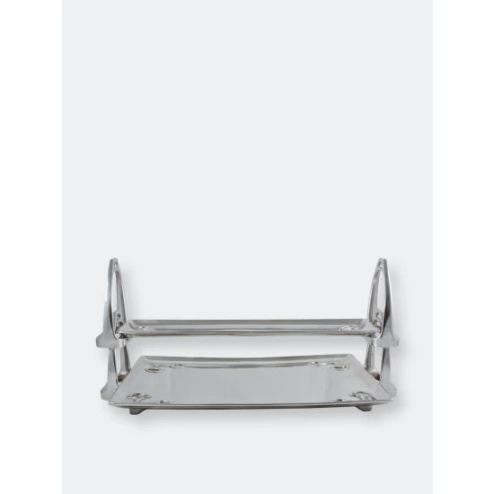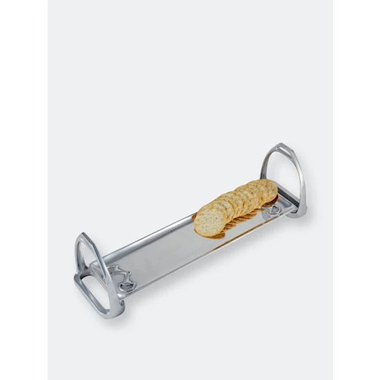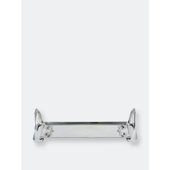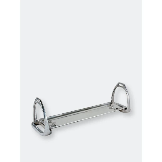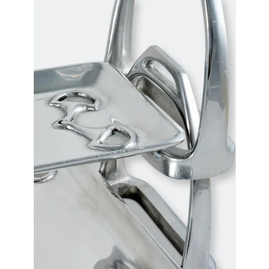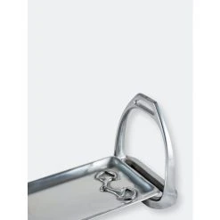 Featuring a rectangular shape, with realistic stirrup irons serving as the handles, sleek equestrian design defines our small Arthur Court Equestrian Bit and Stirrups Serving Tray. Slightly raised edges allow for carrying without worry. Bas-relief D-bit designs decorate the handle ends of the tray. This tray is highly engravable, with plenty of middle space for messages, just take to your local engraving shop when you receive it.Our small Bit and Stirrups tray is designed to be stacked with the matching larger size tray (sku 112H14) if desired. (each tray is sold separately).