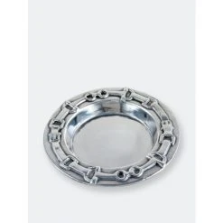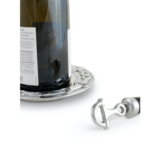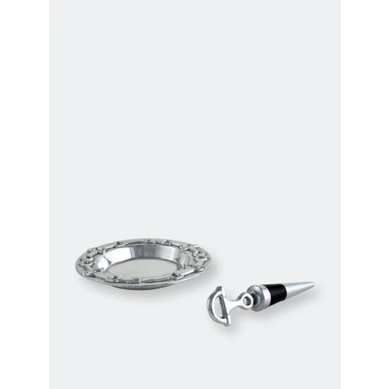 Add horse-inspired flair to your next wine party with this Arthur Court equestrian wine coaster and stopper set. Both pieces are crafted from signature aluminum alloy for durable strength and classic elegance. The coaster has a signature bit-and-strap embellishment around its diameter that coordinates with the bit adornment on the stopper. This set isn’t just for looks — the coaster protects tabletops against rings caused by condensation, while the stopper keeps wine fresh with its tapered body and rubber inlay. Both pieces are compliant with FDA regulations for food-safe use. If the coaster or stopper gets dirty, dust it with a damp cloth. This durable set won’t tarnish and retains its beauty for years to come. This Arthur Court wine coaster and stopper set arrives ready for gifting in an elegant box.Our signature bit-and-strap design circles the coaster, while another bit stands vertically on top of the stopper. Show your love of horseback riding by including this handmade, aluminum set in your barware.