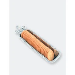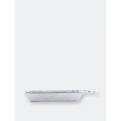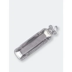 Arthur Court’s Fleur De Lis Cracker tray features a regal design to add elegance to your serving collection. The fleur stylized lily decorates one end and can serve as a handle if needed. Royal style bas relief beading, and acanthus leaves rim the serving area, creating a piece that would be at home in a castle. Guaranteed to prompt compliments from guests when you serve crackers, baguette slices or nibbles from this classic Arthur Court design serving tray.