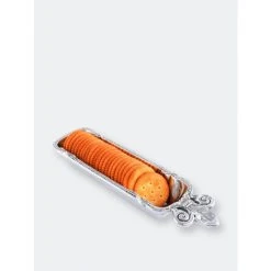 Arthur Court’s Fleur De Lis Cracker tray features a regal design to add elegance to your serving collection. The fleur stylized lily decorates one end and can serve as a handle if needed. Royal style bas relief beading, and acanthus leaves rim the serving area, creating a piece that would be at home in a castle. Guaranteed to prompt compliments from guests when you serve crackers, baguette slices or nibbles from this classic Arthur Court design serving tray.