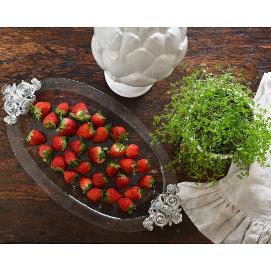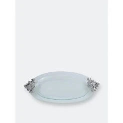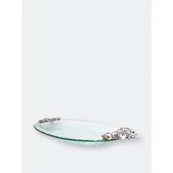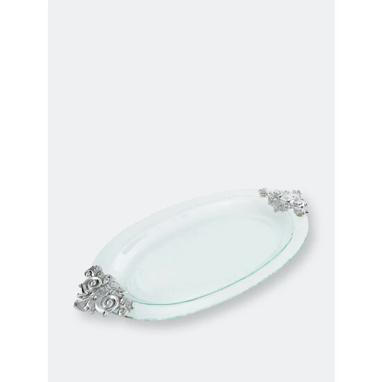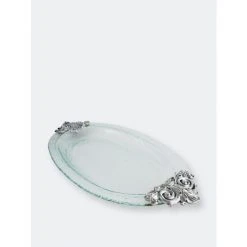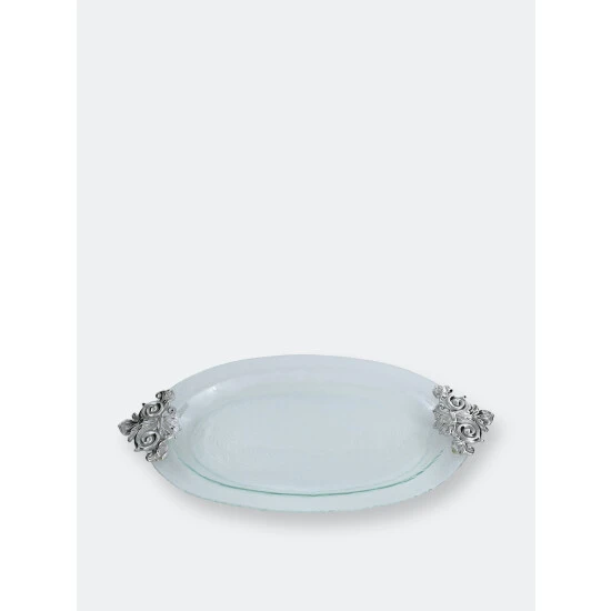 Make gatherings a regal affair with this fleur-de-lis glass platter by Arthur Court. The swirled texture of the clear glass base lends a sense of dimension to this 11 x 21.5-inch server, while the elevated edging helps secure food in transit from your kitchen to your table. Rely on the sturdy sand-cast aluminum handles to assist transport of your culinary creations, and enjoy how the elegant silver-tone finish melds effortlessly with numerous decor styles and palettes. The stylized lilies that form the classic French fleur-de-lis symbol on the handles evoke a sense of royalty and luxury, adding an upscale feel to everything from family gatherings and holiday get-togethers to professional dinner parties and intimate one-on-one meals. Maintenance after use requires only handwashing with mild soap and immediate drying, making after-event cleanup fast and easy. Boxed for gifting, this beautiful fleur-de-lis platter makes an excellent present for newlyweds, new homeowners and anniversary celebrants.Symbolic of French royalty, fleur-de-lis emblems rest on each end of this piece and act as handles.