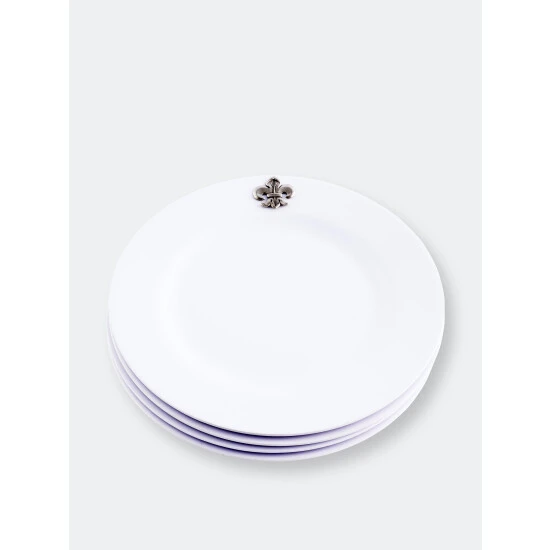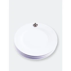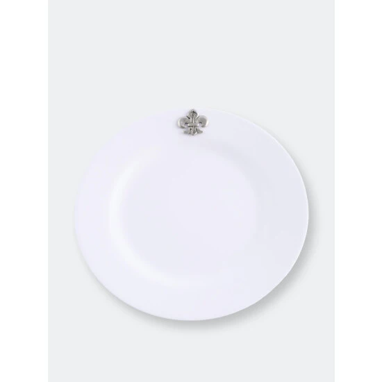 It is said that the best color for presenting food is white – and Arthur Court agree! White dishes make food look more elegant and appetizing. Our pure white Melamine resin is durable, fire and heat resistant and virtually unbreakable the perfect plate for outdoor dining. In true Arthur Court style, a detailed pewter metal Fleur de Lis is attached to rim to create classic dinnerware that will stand up to outdoor use but formal enough for indoor dining.