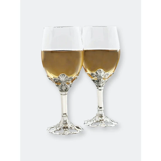 Set a tone of opulence by serving guests in these fleur-de-lis wine glasses by Arthur Court. Lustrous sand-cast aluminum comprises the base, stem and bowl, providing a sturdy base and complementary balance to the simple, clear glass cup, which lets the beauty of your favorite vintages shine through. Intricately detailed fleur-de-lis designs adorn the timeless silver-tone elements, evoking an ambiance of luxury and regal flair thanks to the stylized lily’s connection with French nobility. Enjoy pleasant service and sipping from this sophisticated stemware — it has a 3-inch diameter for easy pouring and an 8-inch height for easy lifting.Complementary flourishes connect fleur-de-lis symbols together at the base, while additional emblems also accent the bottom of each bowl. The handmade, aluminum glistens against the whitest wines, adding even more esteem to these glassses.