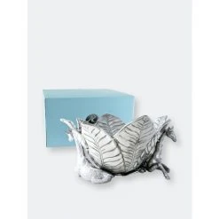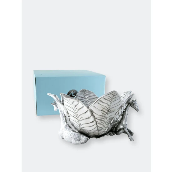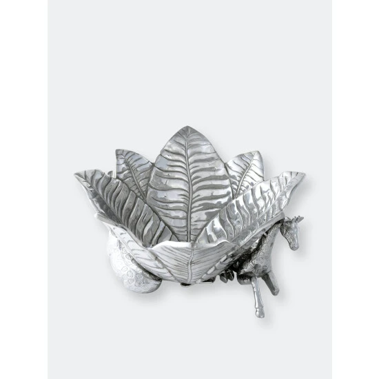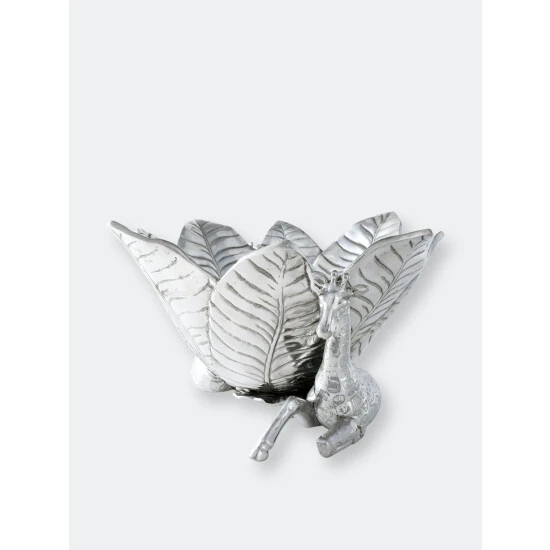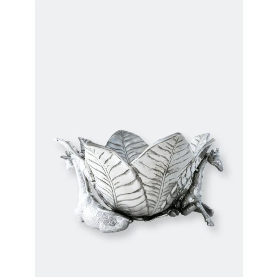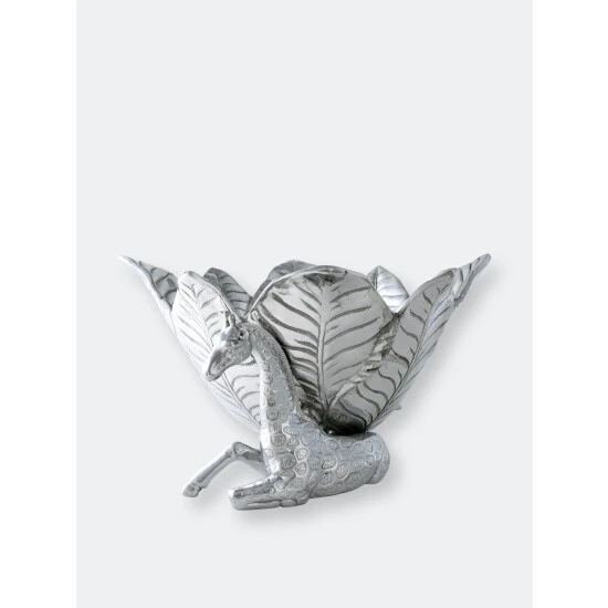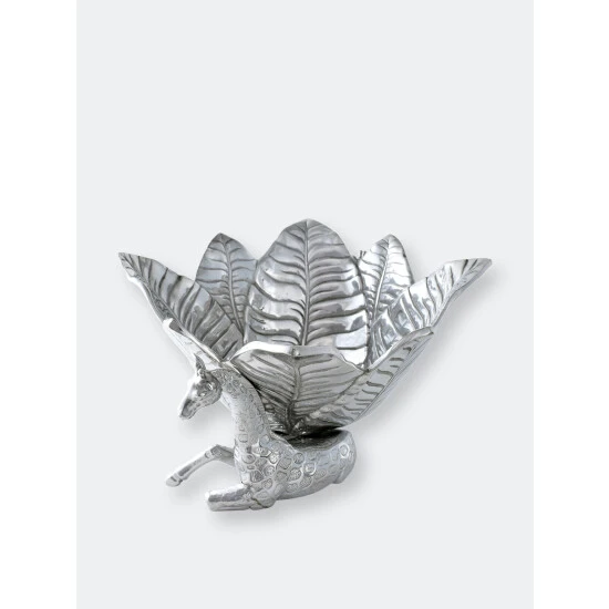Complement your Safari Collection with the innovative design of Arthur Court’s Giraffe Ice Bucket.Large, veiny leaves connect at the base before fanning out in all directions to create the bucket’s unique edges. Realistic giraffes rest on either side of this handmade, aluminum piece as they help support the droopy foliage with their long necks. Pointy ears and patterned spots on the animal’s fur give these statuettes tremendous, lifelike appeal.