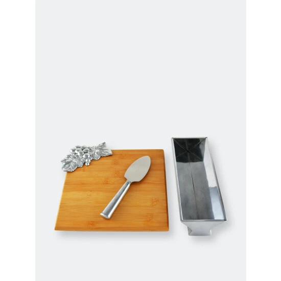 An intricate bundle of grapes and leaves adorn the lower-left corner of this board, while an elegant cheese triangle and cracker stand act as additional accents. The lustrous finish of these handmade, aluminum designs mixes nicely with the bamboo.Pair your favorite fermented foods together with this Grape Bamboo Cheese Set from Arthur Court.