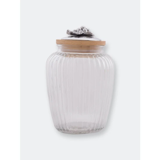 Uniquely shaped, stripe patterned glass canister with a natural, elegant and environmentally sustainable Acacia wood lid. Detailed metal art in aluminum, a grape cluster knob tops the jar with a premium silicone sealing ring. Airtight seal maintains perfect environment for keeping dry goods fresh.