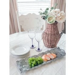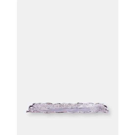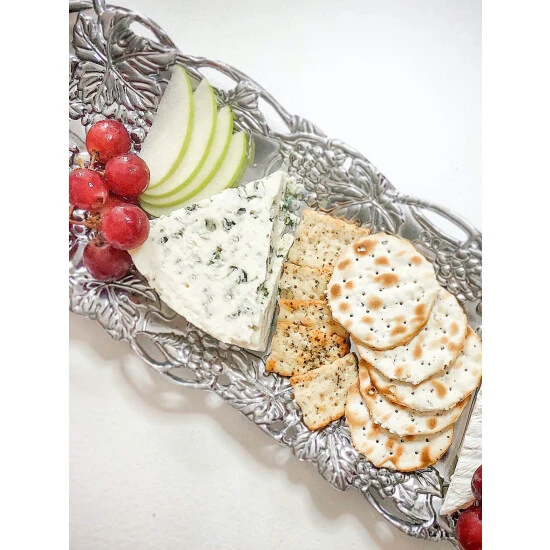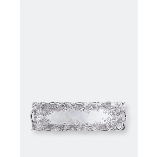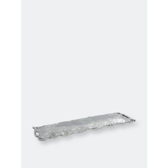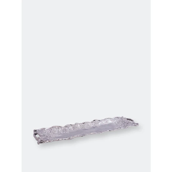 A dense collection of vines and leaves create the dish’s open work border, while bundles of grapes hang off of it into the middle. The striking details of the fruit and foliage gives this handmade, aluminum tray remarkable definition.