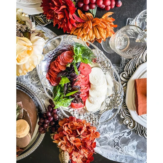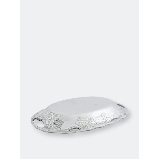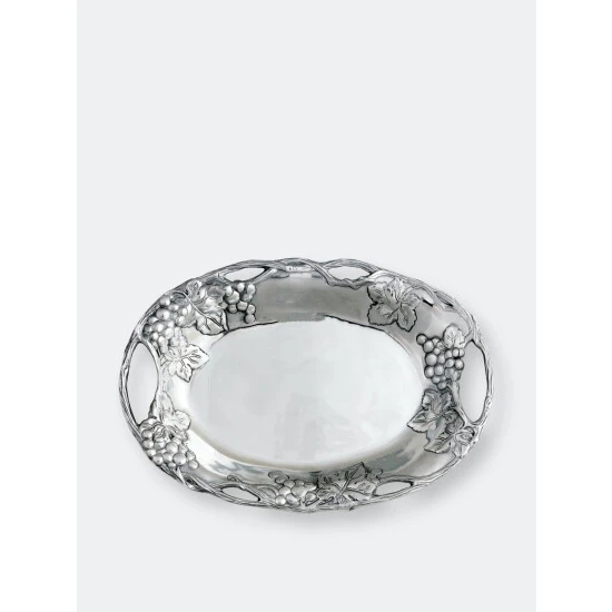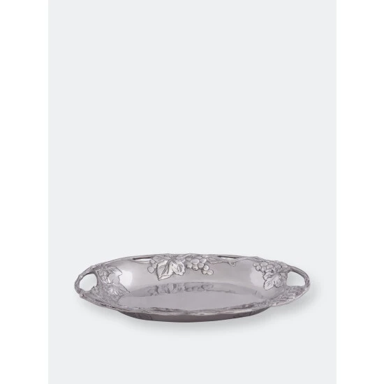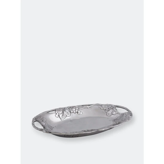 Display the vineyard’s natural appeal on your table with this Grape Oval Tray from Arthur Court.Twisting vines create the piece’s openwork border, while bundles of grapes and leaves hang just below the edges. The rounded features of the fruit and the rough, textured lines in the vines and leaves offer realistic detail to this handmade, aluminum design.