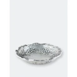 Twisting vines create the openwork border on the edge of this dish, while bundles of grapes and leaves nestle into the sides of the interior. The incredible definition captured within the robust grapes and veiny leaves makes this handmade, aluminum bowl seem half full. Settle your favorite noodle dish into the attractive bed of fruit and foliage in Arthur Court’s Grape Pasta Bowl.