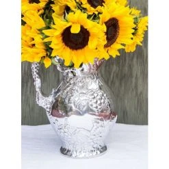Plump bundles of grapes spring up all over this piece as veiny leaves and swirling vines inject themselves into the fruity designs. The unpredictability of these vines influence the unique shape of the pitcher’s handle and mouth. Heavy lines distinguish the detailed motifs from the surrounding aluminum in this handmade pitcher. Produce an instant reaction from your guests when you unveil this best-selling Grape Pitcher from Arthur Court.