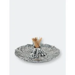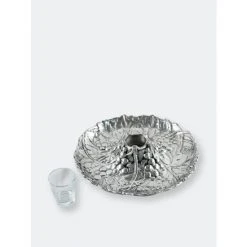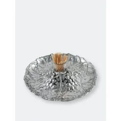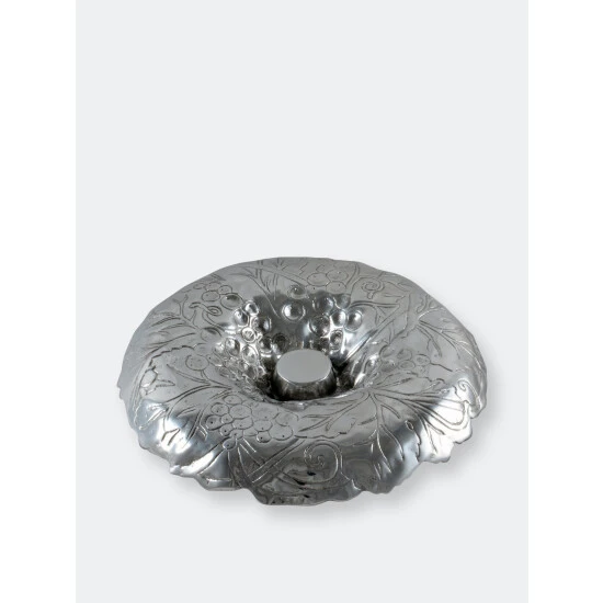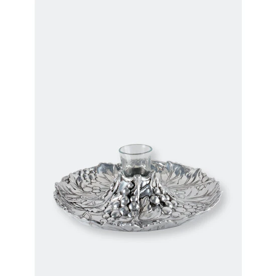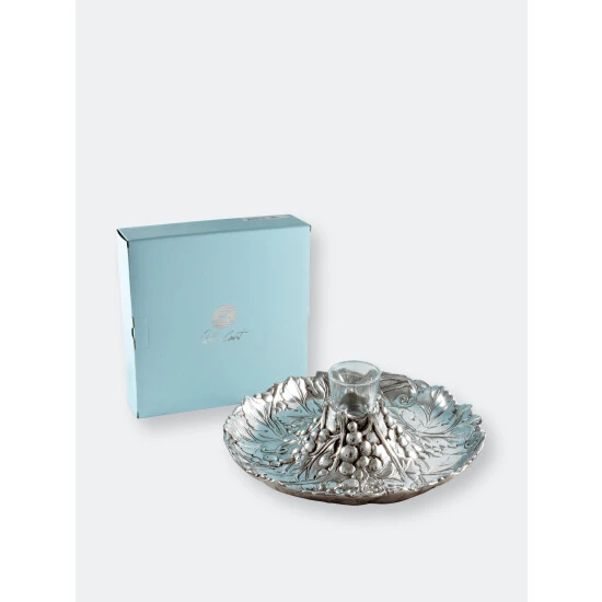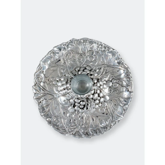 Round coupe tray with filigree edges is a vineyard fantasy of grape bunches, leaves and vines. Featuring a votive-sized glass holder in the middle, this tray is a stunning way to serve an assortment of crudités, nuts, olives or any tidbit collection. The glass holder in the middle will hold picks, hors d’oeuvres forks or even a tealight candle. A beautiful addition to your serving collection, this server is perfect for al fresco cocktail parties or movie nights.