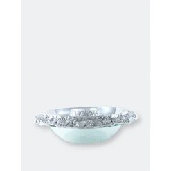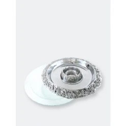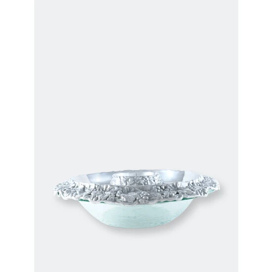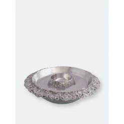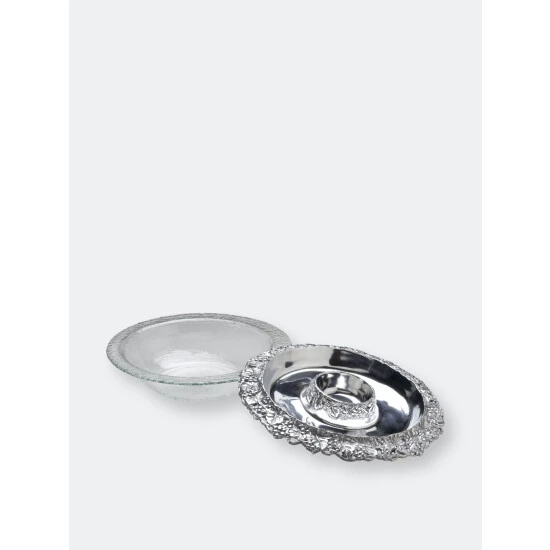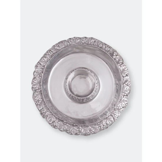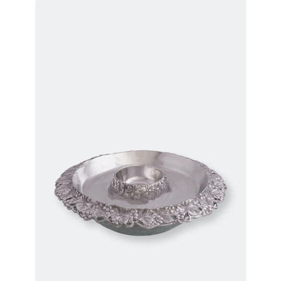 Enjoy your favorite dish chilled to perfection and displayed with elegance in the grape-themed, glass-bottomed serving tray from Arthur Court. A circular tray with a small condiment well in the center rests snugly atop a sturdy glass bowl with a flat bottom, embellished in the Grape motif. Thick vines meander around the perimeter of the tray, with large clusters of grapes dotting the edges. Leaflets, delicately wrought with stems and vine sprigs, accent the plants. Use the glass bowl included with the serving tray to chill your favorite cold appetizers, such as shrimp cocktail or cold hummus. Wash both items by hand with gentle soap and dry. Polish the aluminum with chamois if desired. Arthur Court’s signature grape motif adorns the sauce bowl and borders the outside edge of this piece like a patterned tablecloth. The handmade, aluminum tray fits seamlessly into the bowl, making it the perfect way to chill any food over ice.