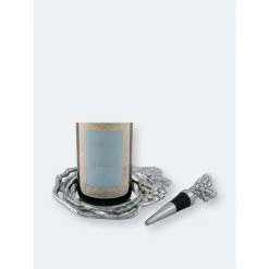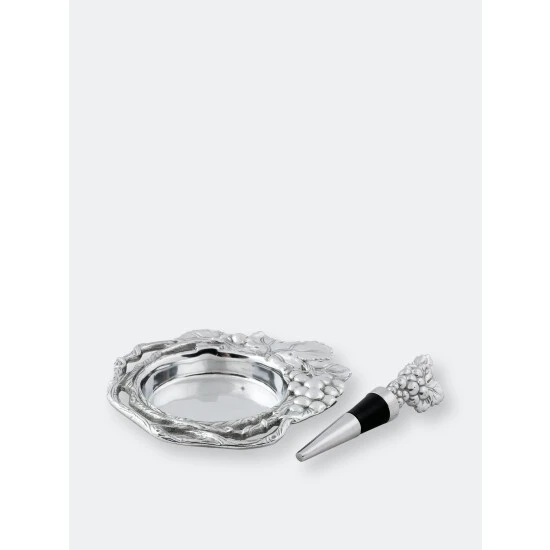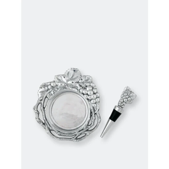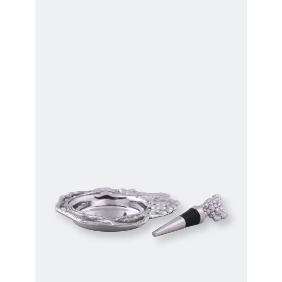 Designed as the proper size for a bottle of wine, this Arthur Court Grape Wine Coaster and Stopper set is quite versatile, the coaster will protect surfaces from any bottled liquid you are serving. Both pieces are cast in our lovely Grape and leaves pattern. Stopper is rubber coated for a snug fit.Distinguished bundles of grapes and leaves attach to the layered vines that swirl around the coaster, subtely drawing your eyes into the center. Another collection of grapes tops the stopper and highlights the incredible definition within this handmade, aluminum design.